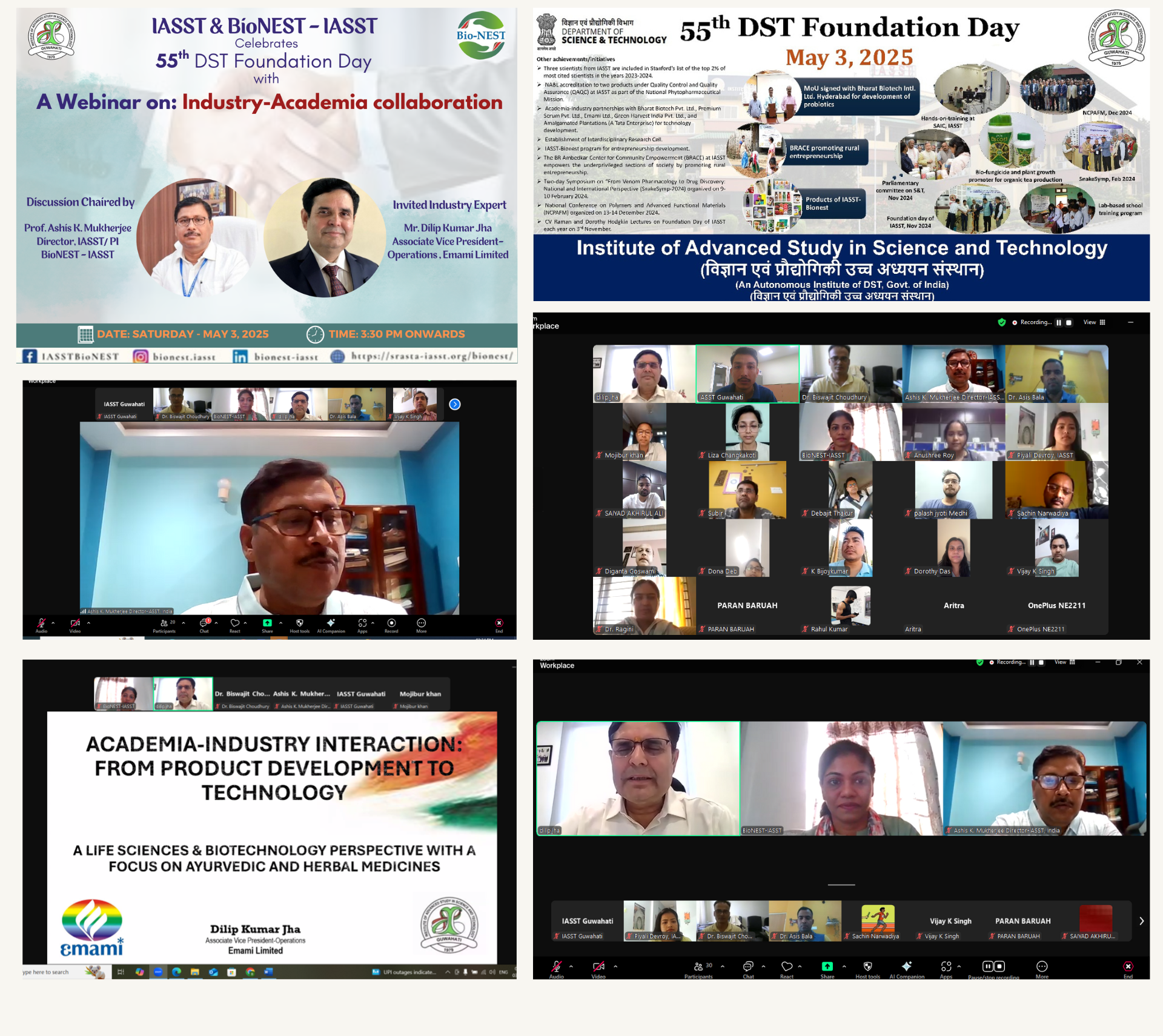 The Institute of Advanced Study in Science and Technology (IASST) and BioNEST-IASST presented a webinar on ‘Industry–Academia Collaboration’ on May 3, 2025, to celebrate the 55th DST Foundation Day. Prof. Ashis K. Mukherjee, Director of IASST, stressed industry-academia ties in his welcome address. He stressed the importance of academic-industry collaboration in innovation, research translation, and social impact. The industry expert, Mr. Dilip Kumar Jha, Associate Vice President of Operations at Emami Limited, Guwahati, delivered a fascinating talk on academia-industry synergy and the product life cycle at the Webinar. The webinar witnessed active participation from research scholars and scientists.